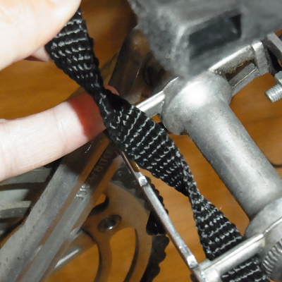 トゥークリップをペダルに装着できましたら、ペダル後方の穴にストラップを通していきます。